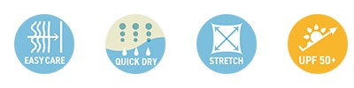 | 機能 | 高伸縮、高キックバック性・UPF50+・ 吸水速乾・着用快適性・イージーケア性・シルエット保持性 |